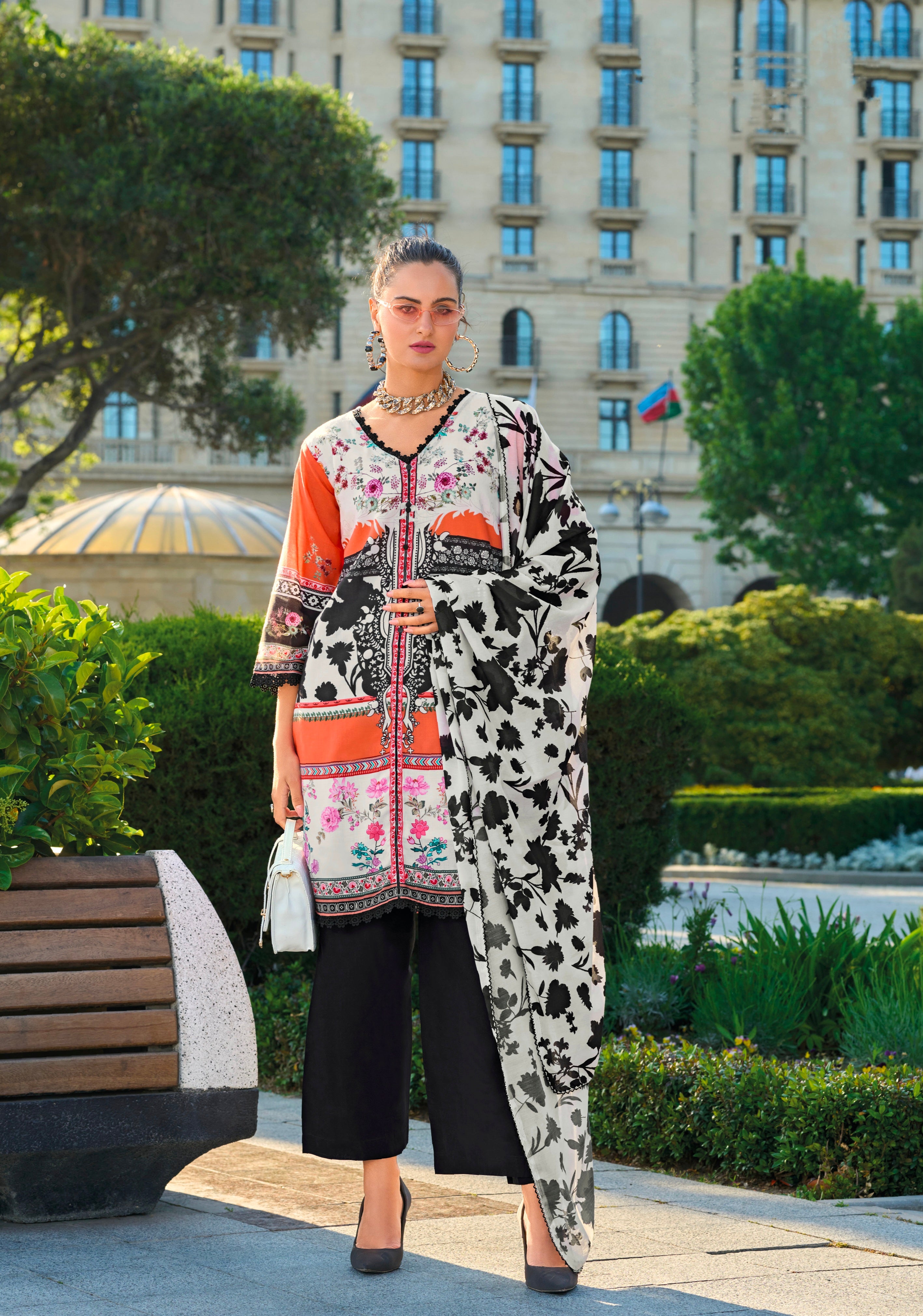 Top: Crafted from high-quality cotton, the top of this kurta set boasts a stunning digital print that adds a vibrant touch to your wardrobe. The print features a harmonious blend of floral and abstract patterns in a rich palette of colors, including shades of orange, black, and white, accented with subtle hints of pink and purple. The V-neck design and three-quarter sleeves offer a flattering fit, while the intricate border details enhance its overall appeal. The fabric is lightweight and breathable, making it ideal for warm weather.