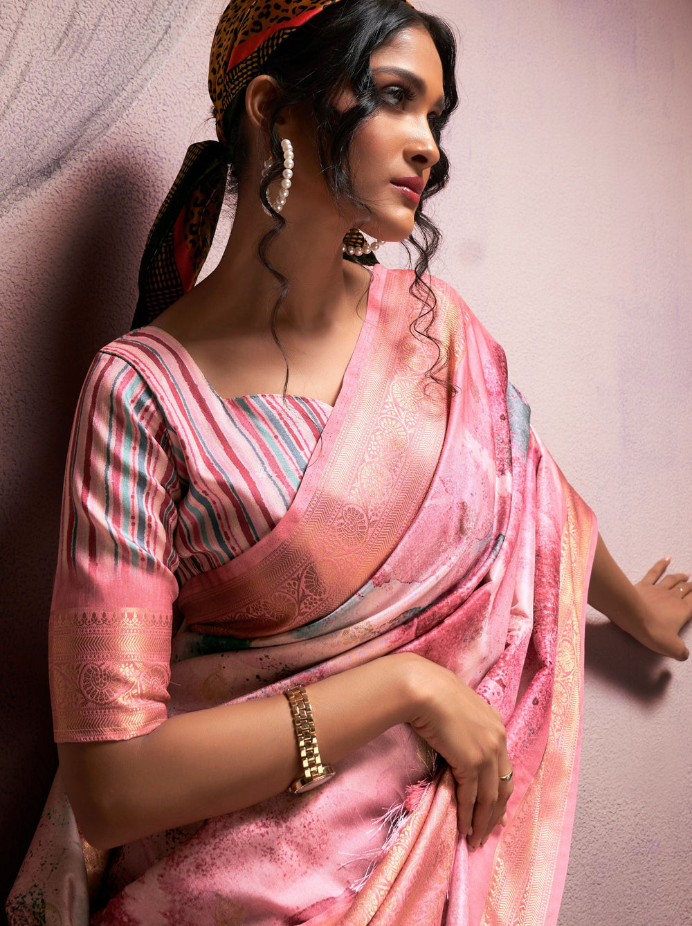 Taffy Pink Pure Banarasi Handloom Digital Printed Silk Saree