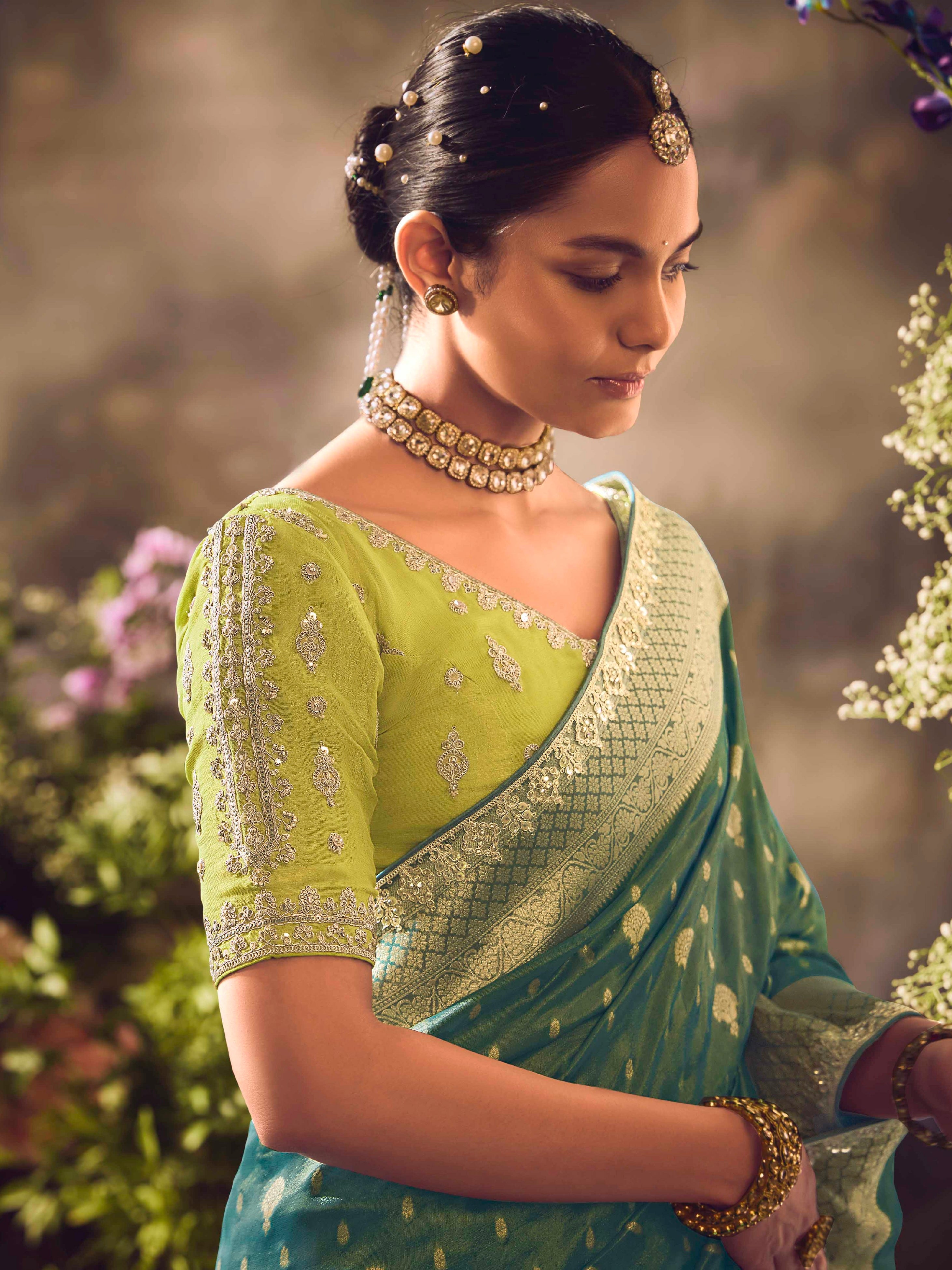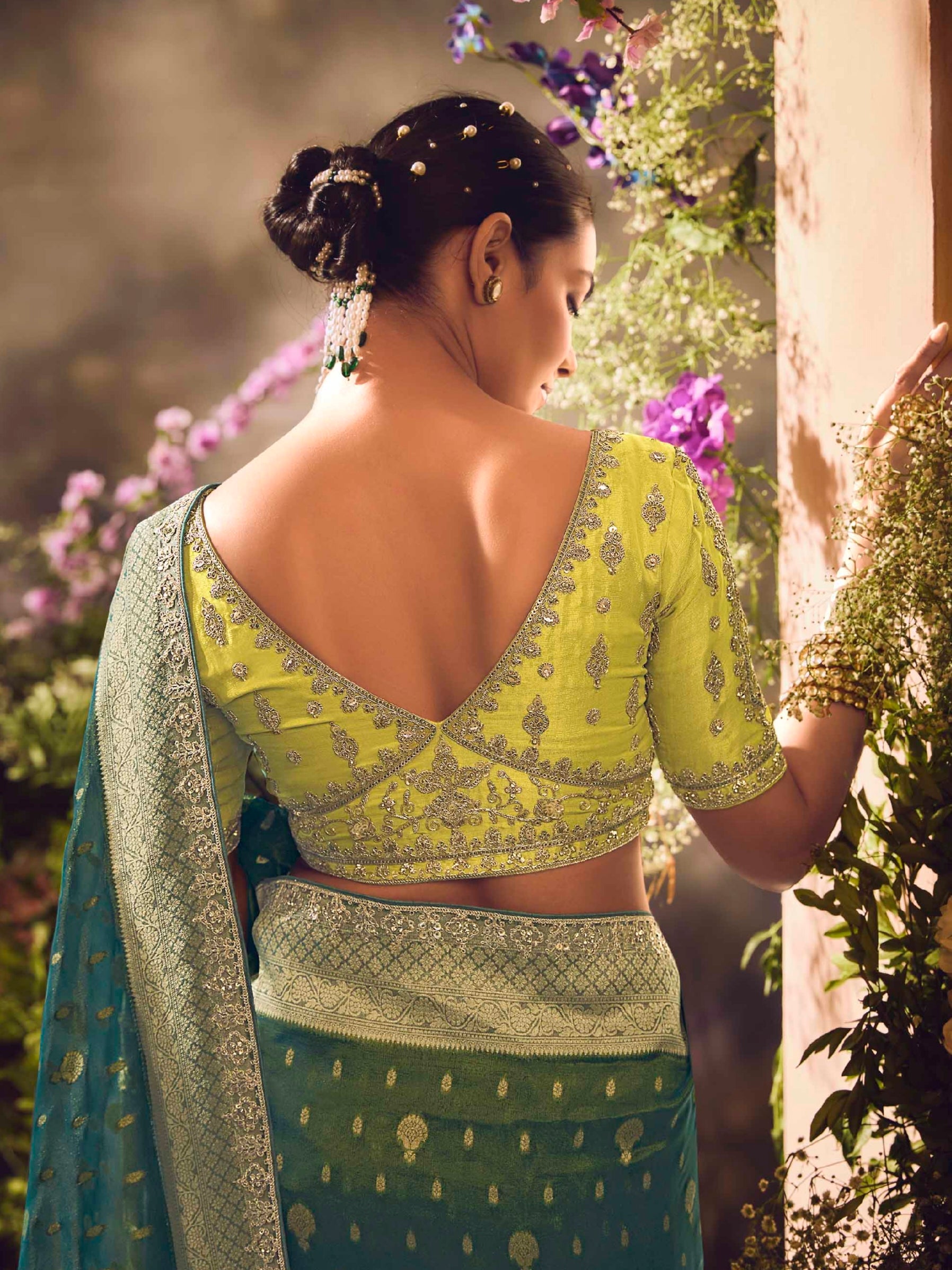 This teal blue Banarasi saree is a timeless masterpiece, combining tradition and contemporary elegance to make you shine at every special event.