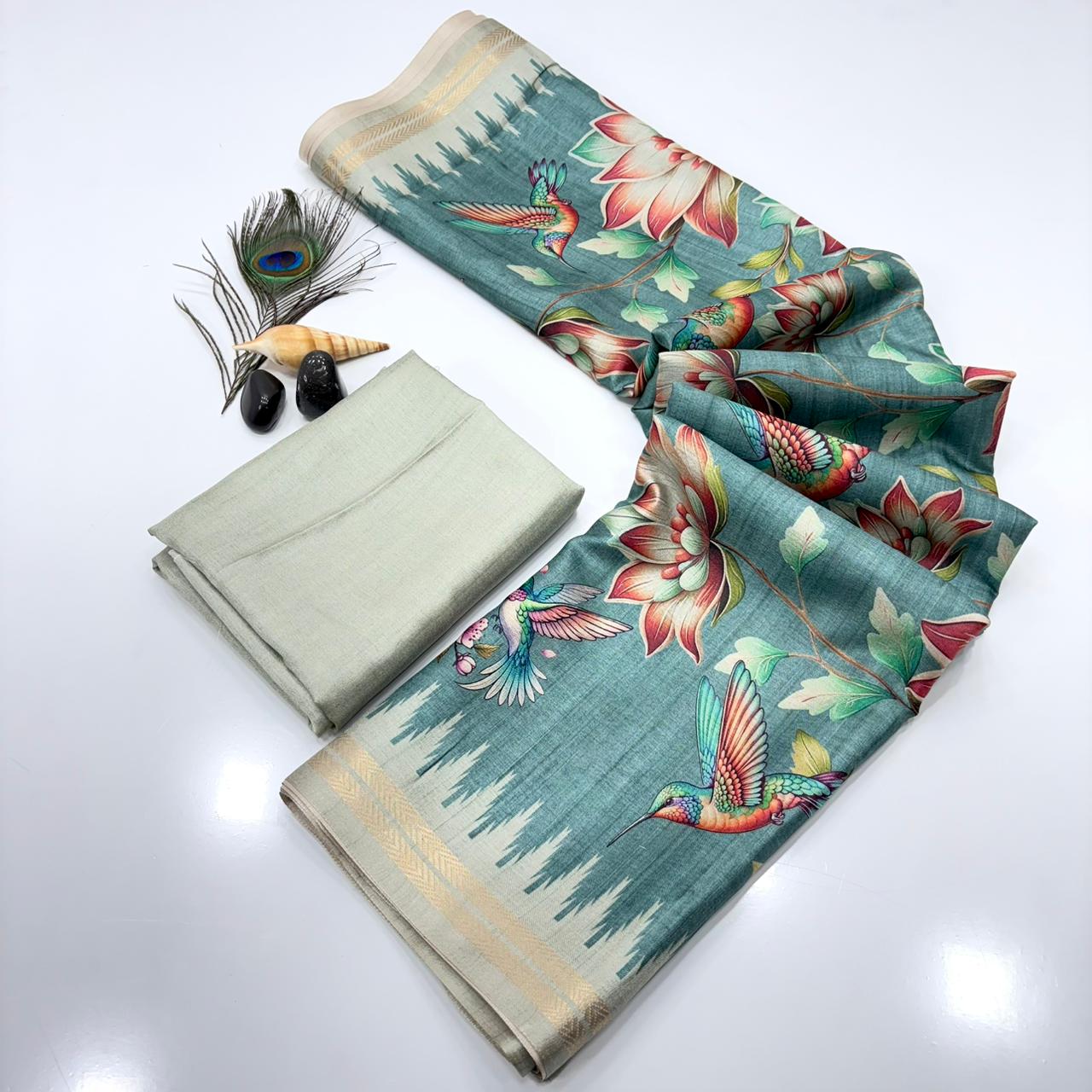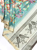 Soft Tussar Silk Sarees with Nature bird prints all over the body having arrow zari woven border on both sides