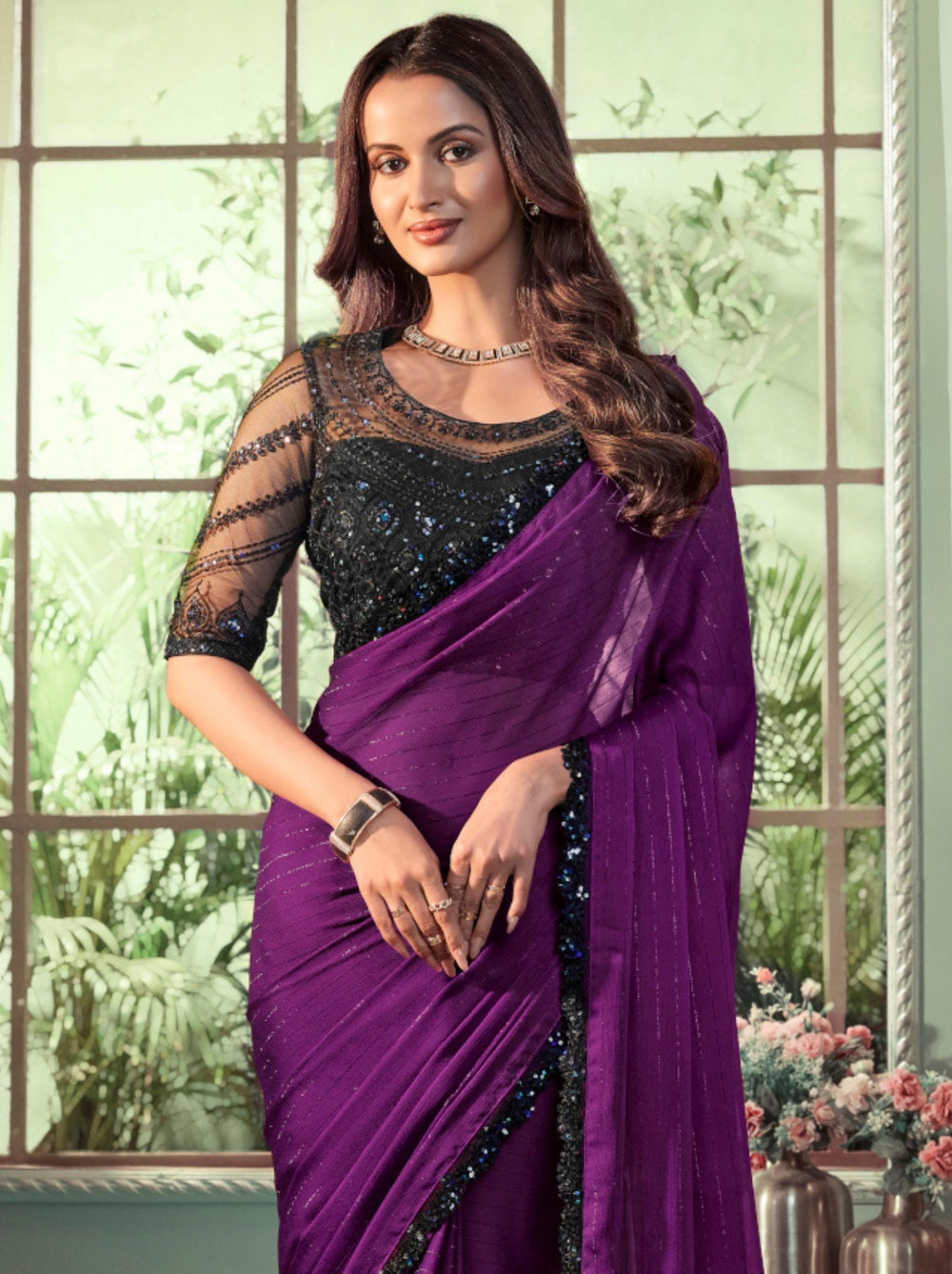 Violet Purple Pure Georgette Burberry Silk With Floral Sequins Saree