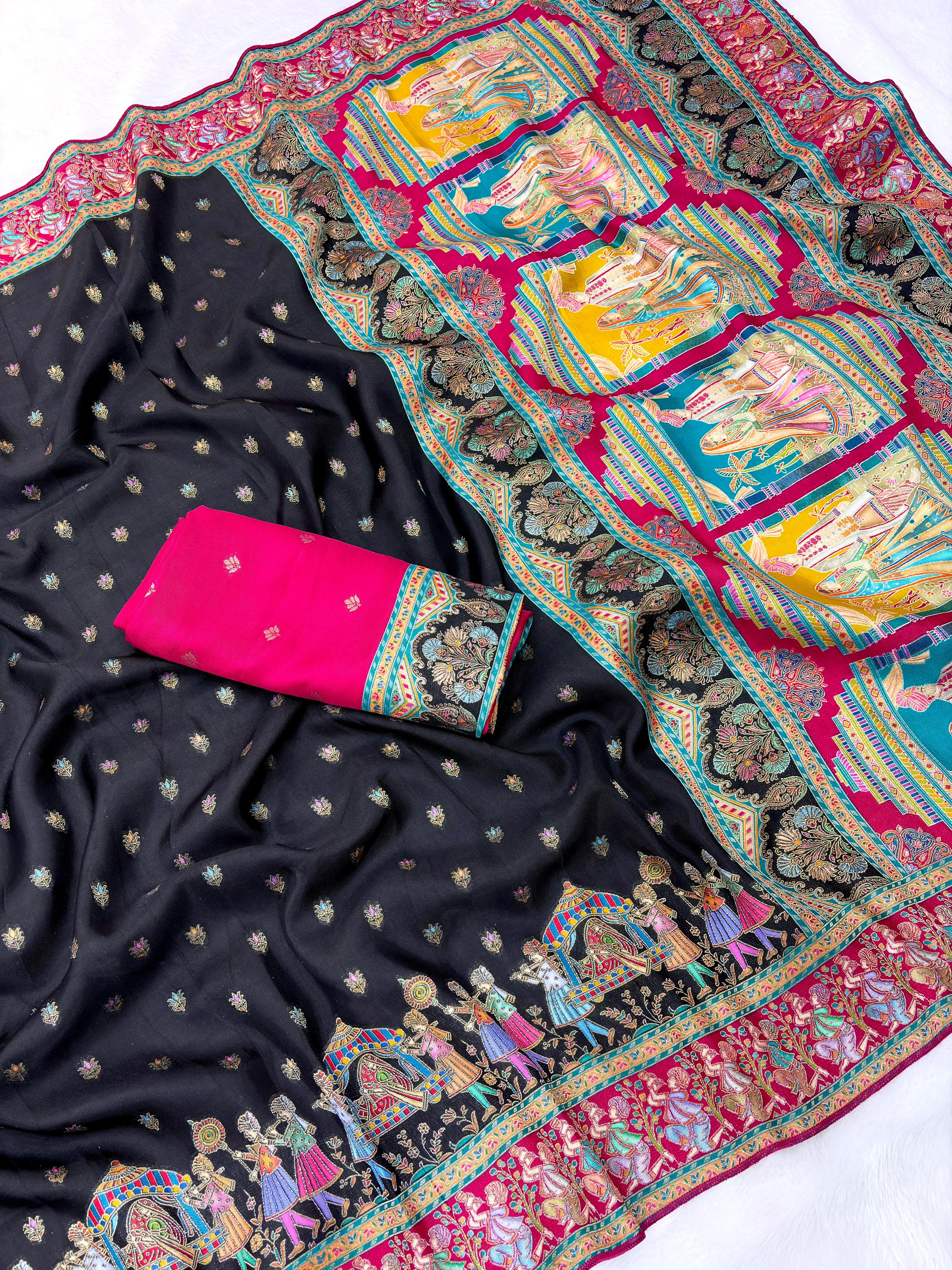 Black Pure Viscose Silk Meenakari Zari Weaving Wedding Saree