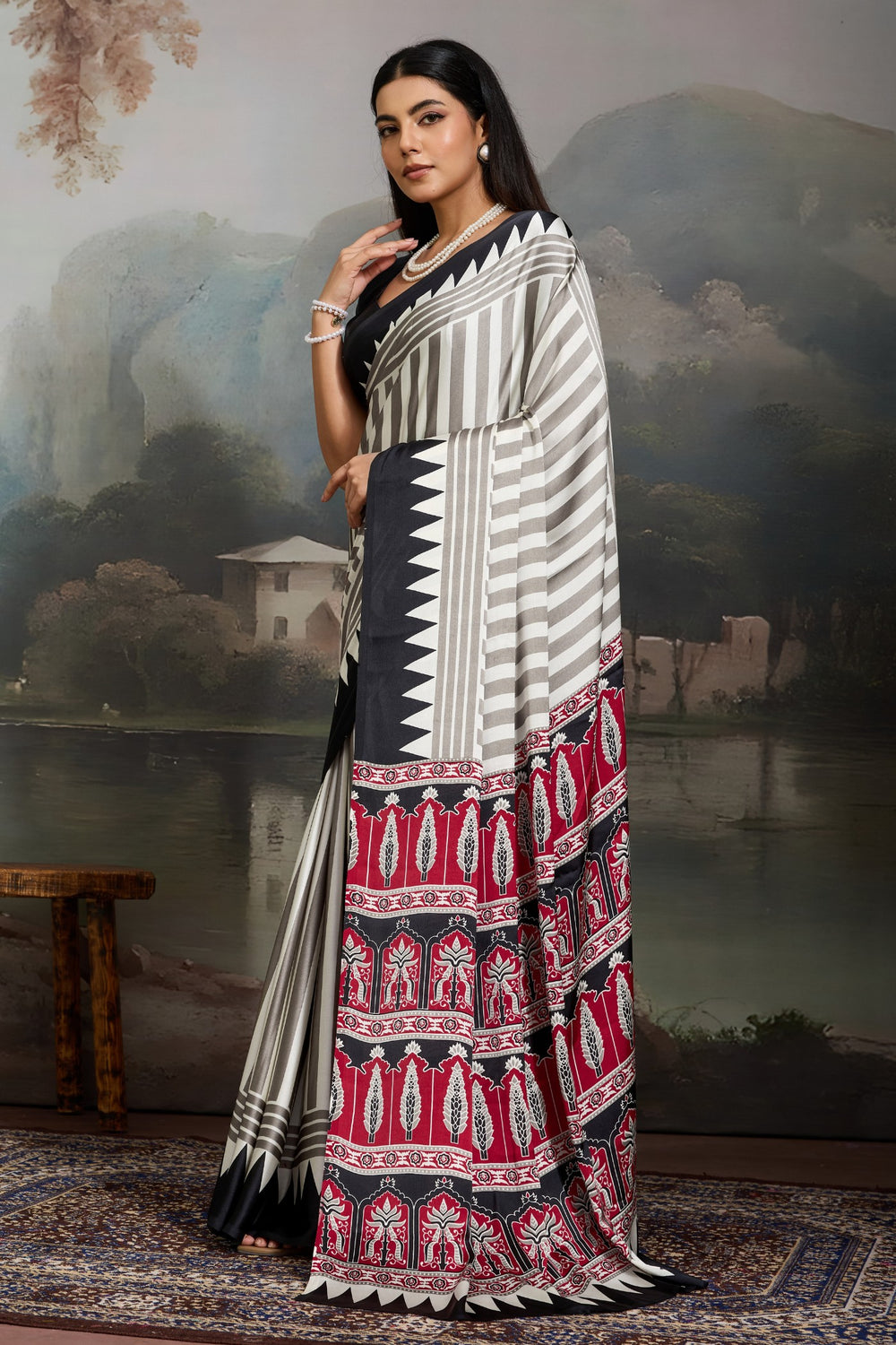 White and Black Pure Ajrakh Printed Satin Crepe Silk Saree
