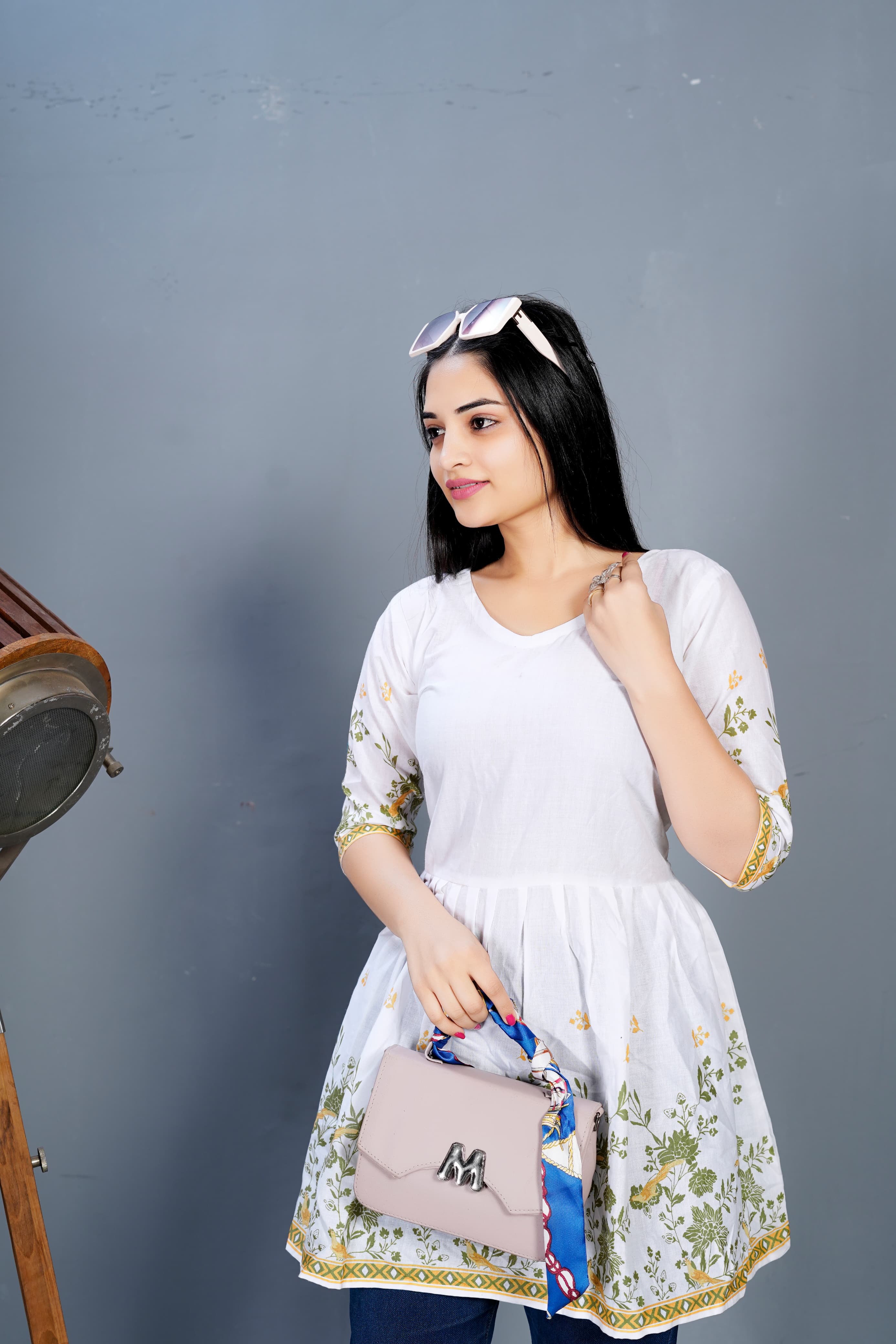 White Pure Heavy Wrinkle Cotton Digital Print Tunik Top