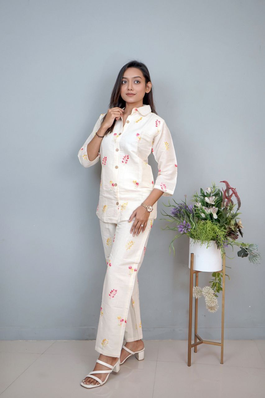 White Pure Soft Cotton With Embroidery Work Co-ord Set