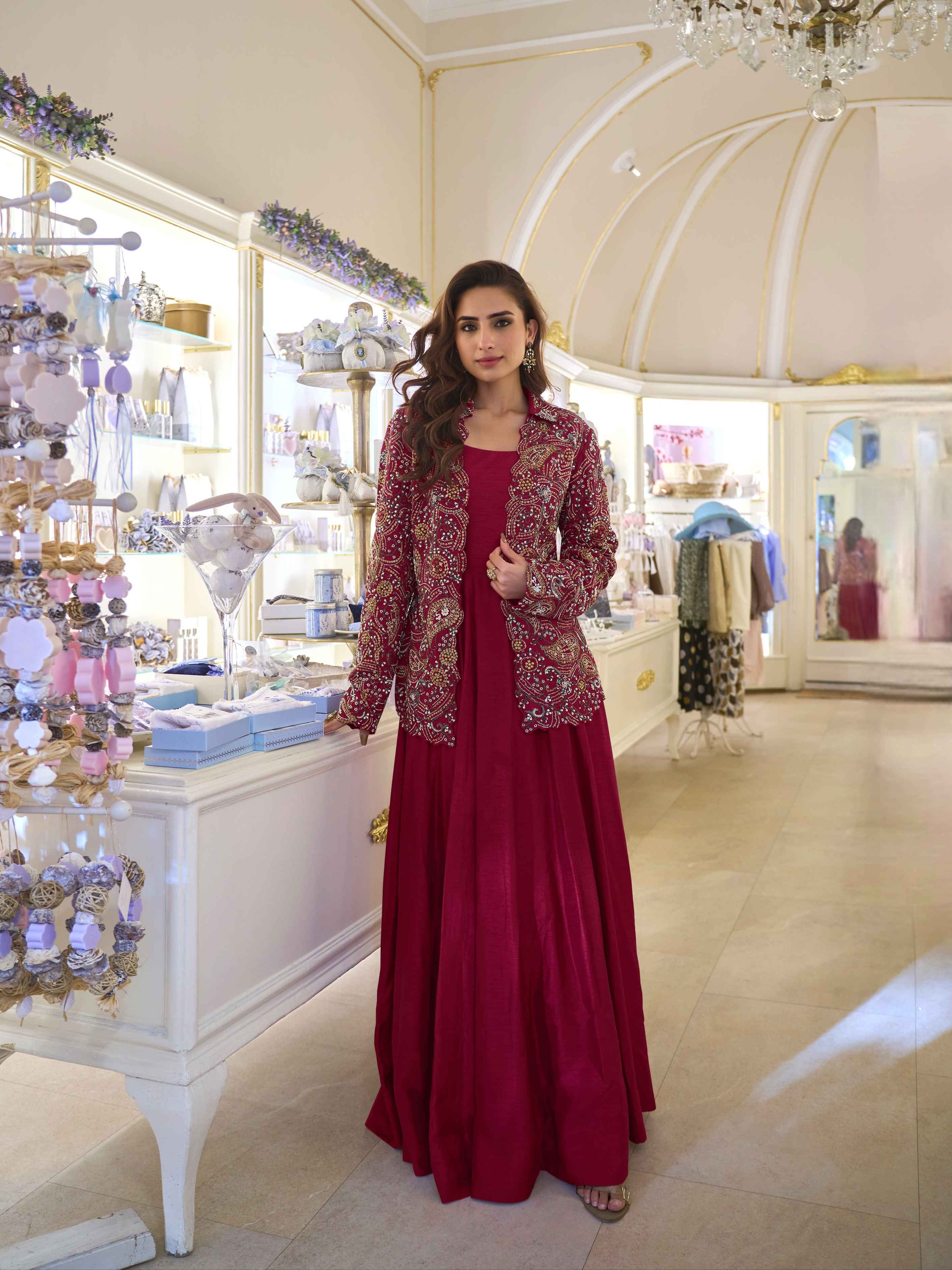 Wine Embroidered Silk Jacket Gown Set with Heavy Beads Work