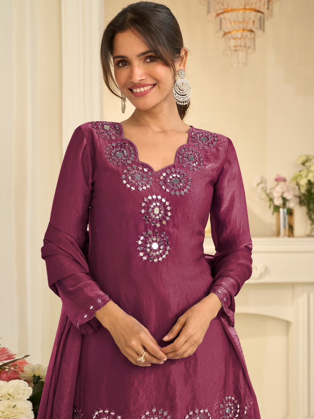Wine Premium Tora Silk Palazzo Set with Heavy Hand Mirror Work