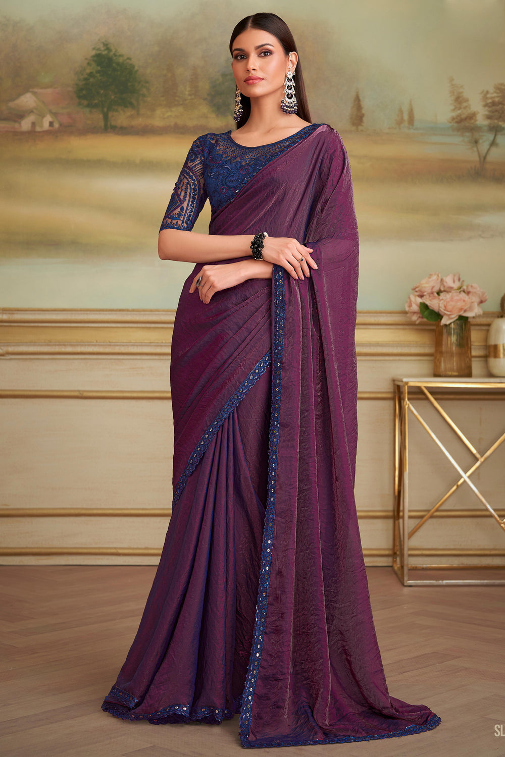 Wine Pure Georgette Silk With Floral Sequins Saree