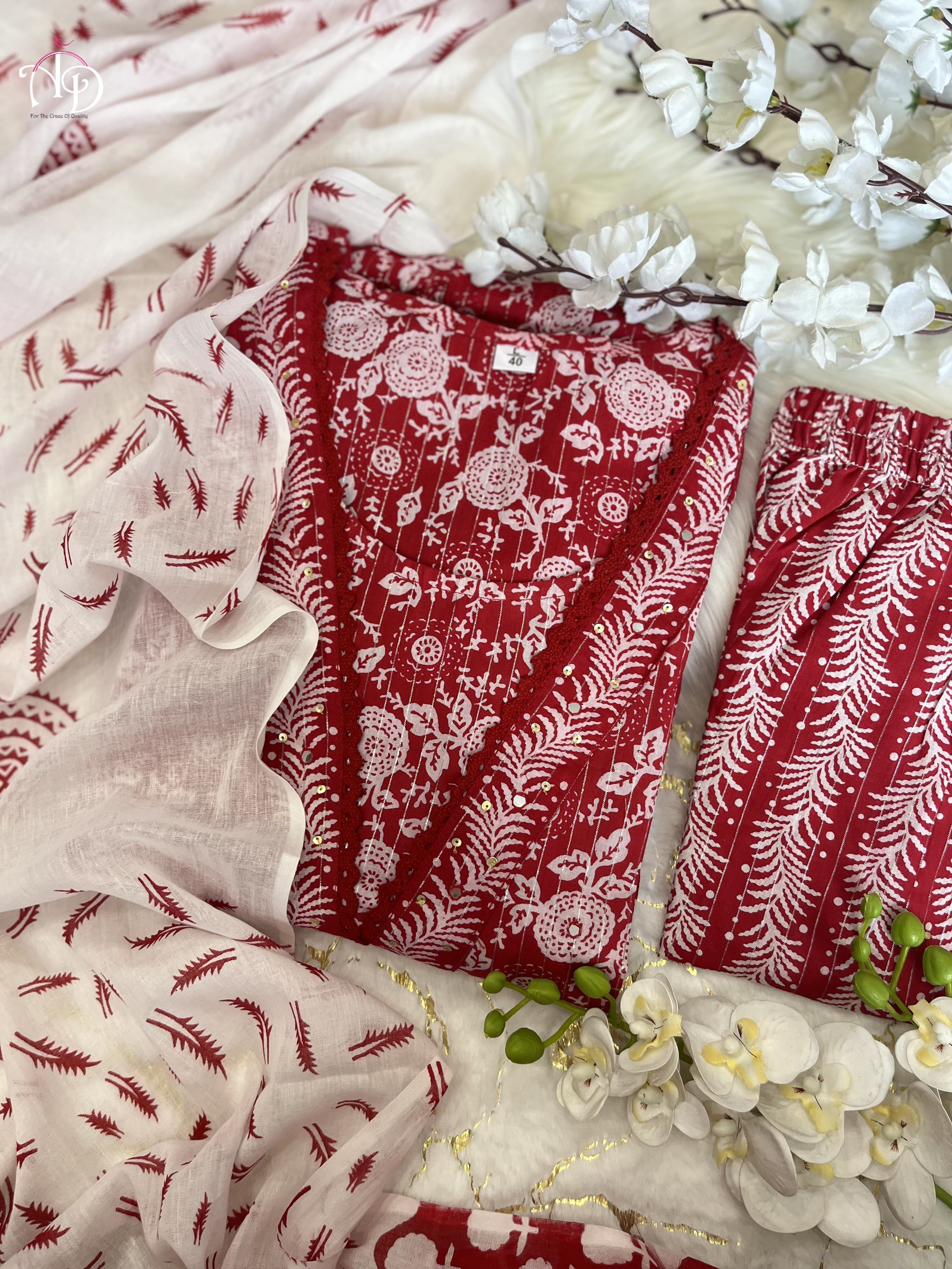 Women's Cotton Printed Red Kurta Set With Palazzo & Dupatta