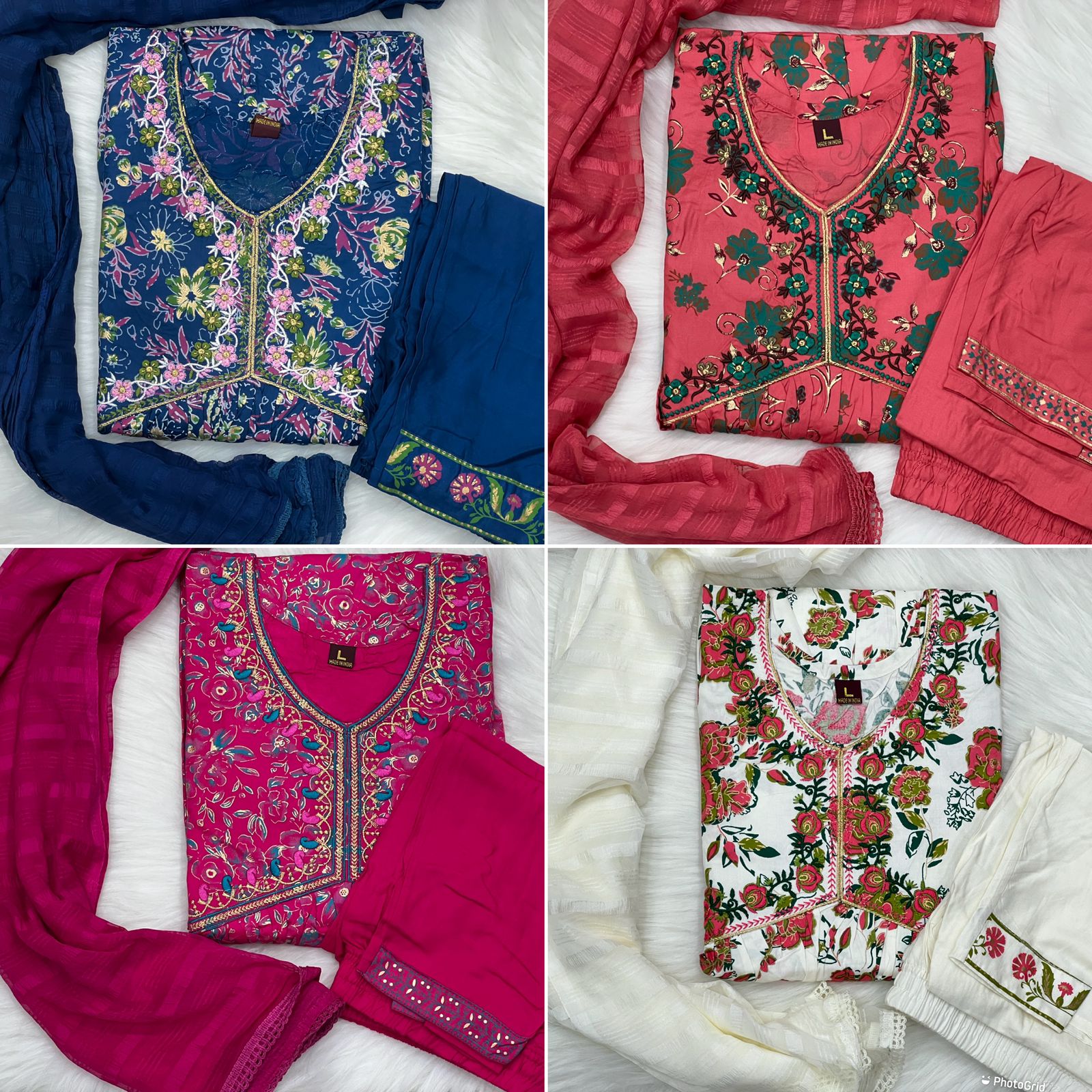 Libaas 14 kg Rayon Foil Print Alia Cut Embroidered Kurti Pant Dupatta Set (1049x08)