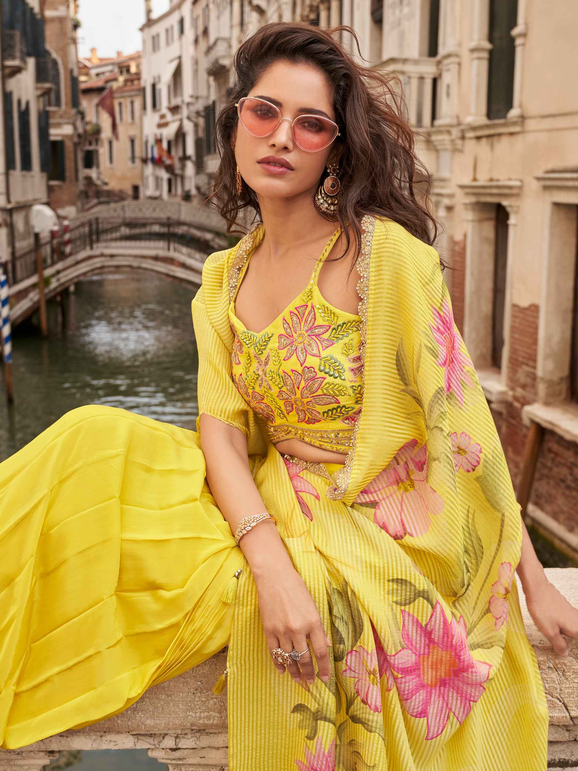 Yellow Chinon Silk Floral Palazzo Set with Designer Shrug