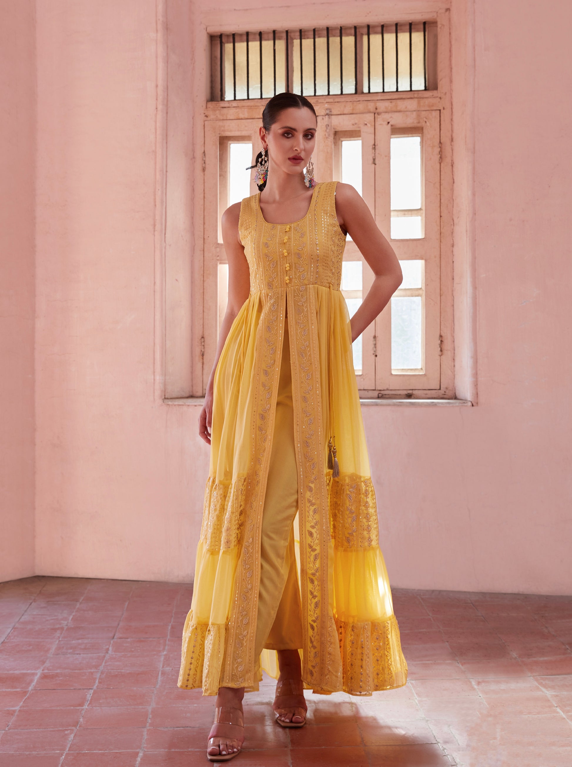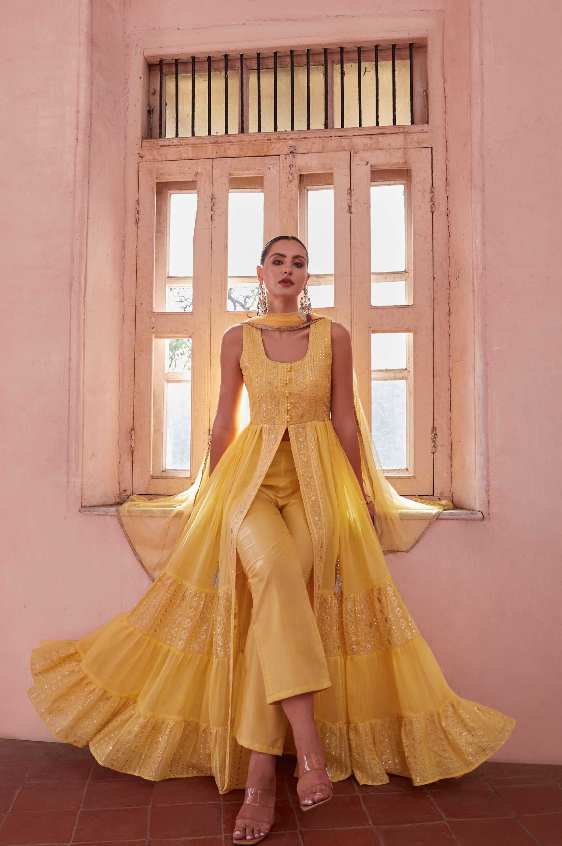 Expertly crafted with intricate zari, thread, and sequins embroidery, this gorgeous yellow anarkali gown features a generous 8 meters flare that elegantly drapes your figure. The front slit adds a touch of modernity while maintaining the traditional charm. Perfect for any special occasion.