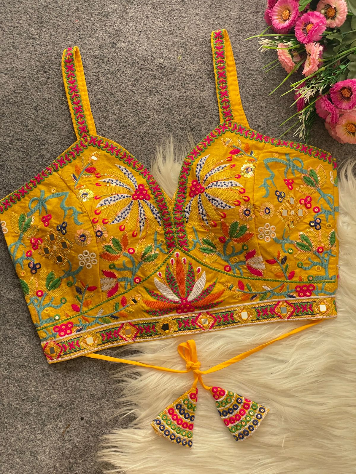 Yellow Pure Heavy Embroidery Spaghetti Sleeves Less Blouse