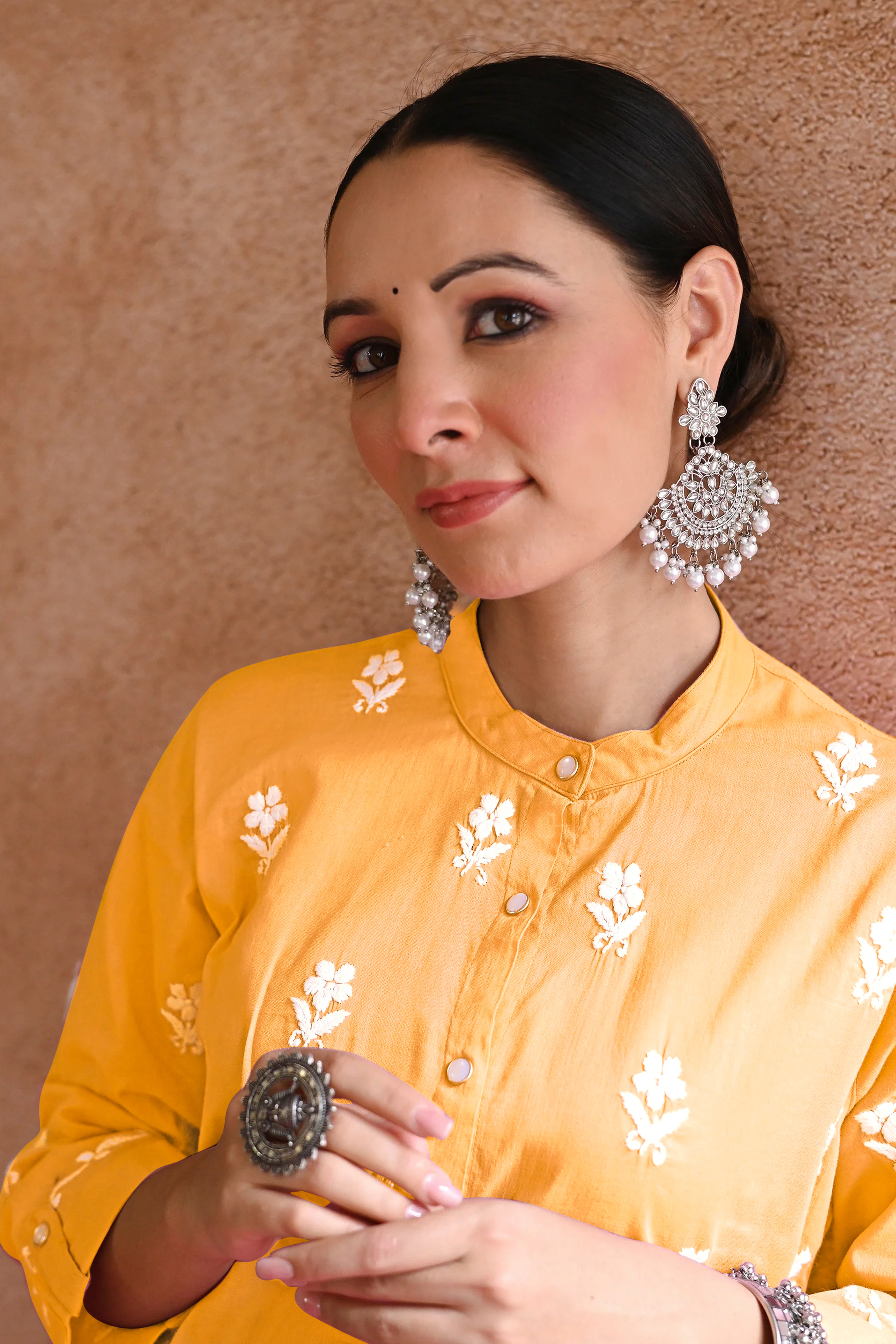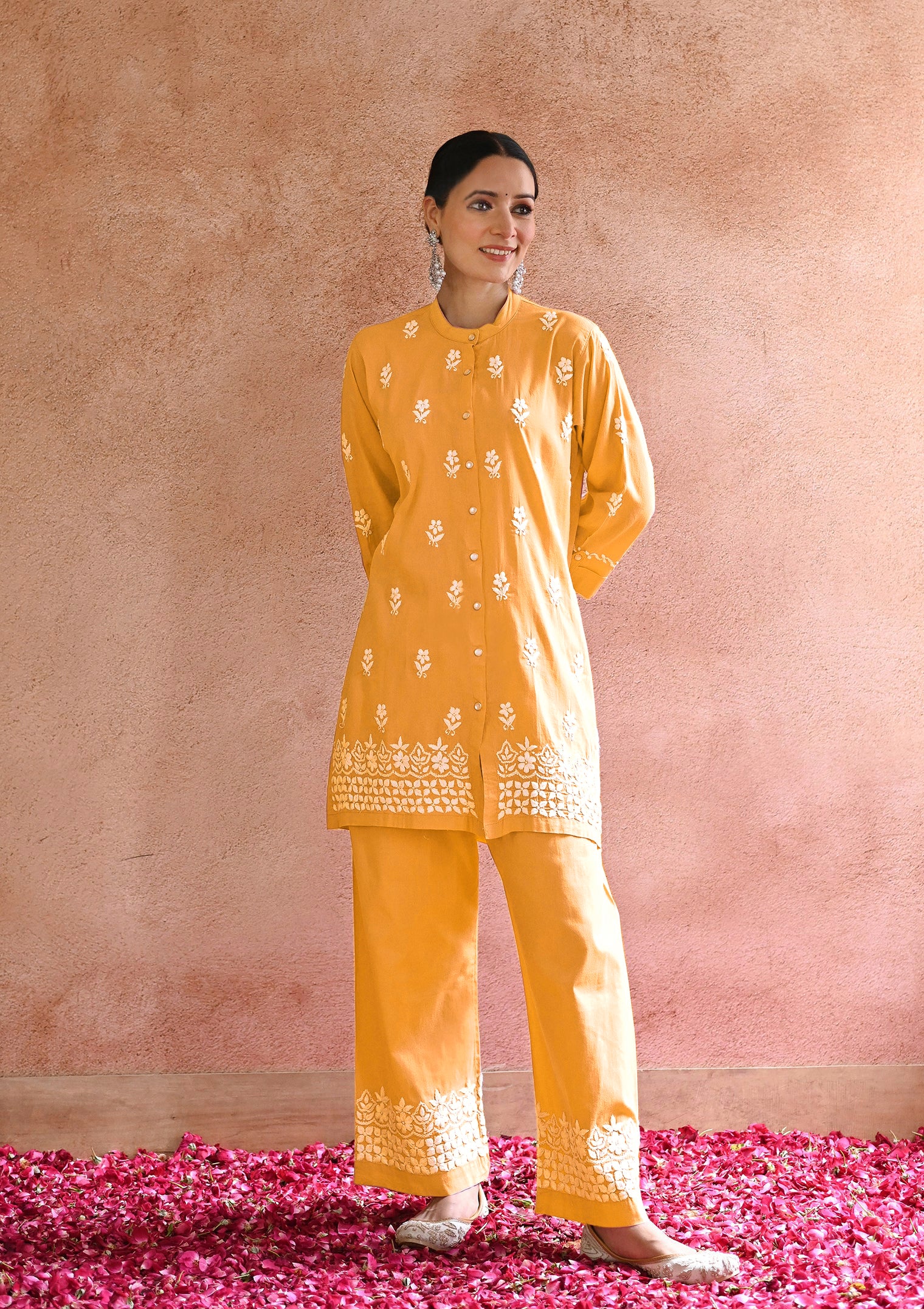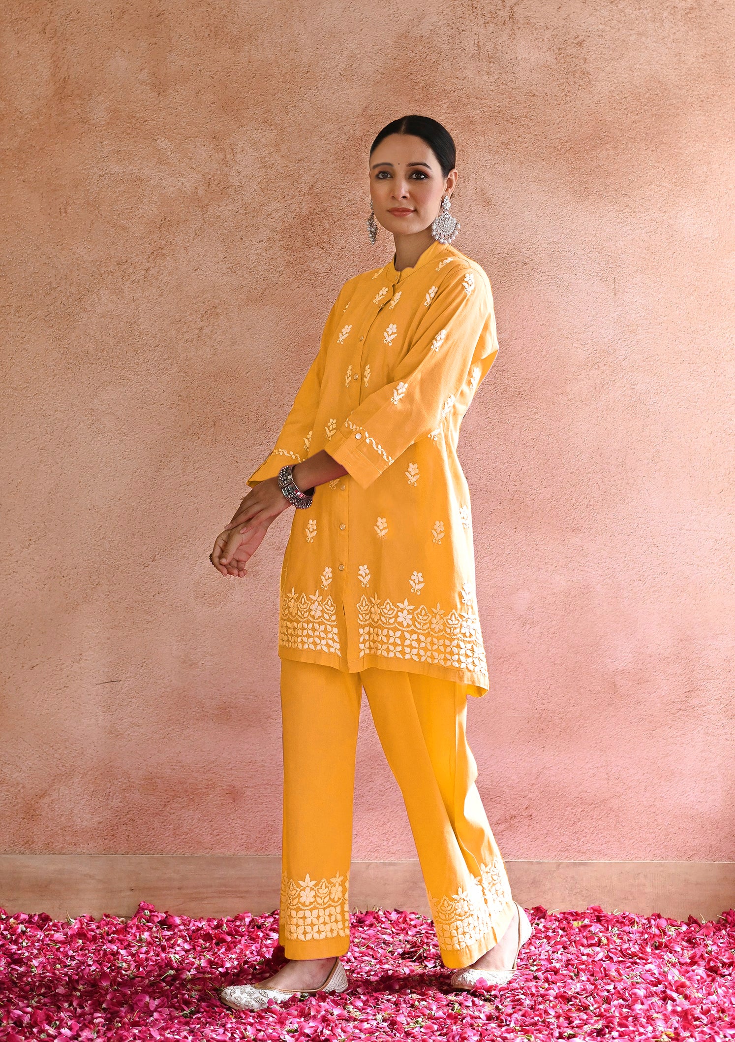 Yellow Pure Heavy Rayon With Digital Print Chikankari Embroidery Work Plazo Suit