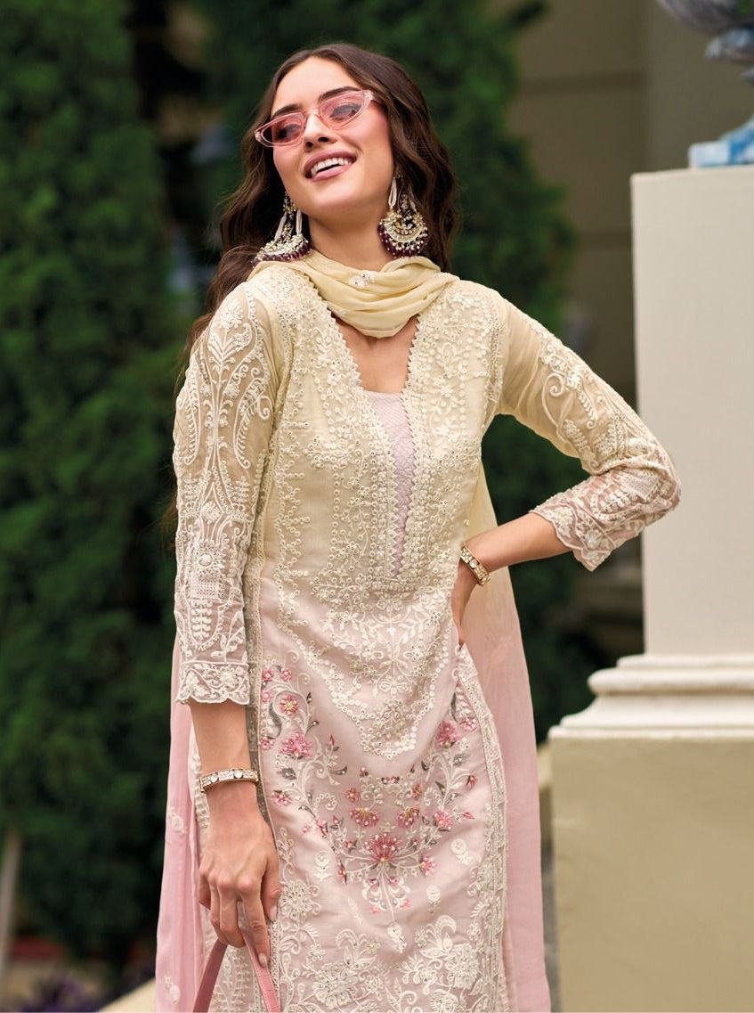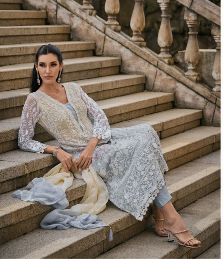 Top - Soft organza with fancy embroidery work with moti work & gpo lace